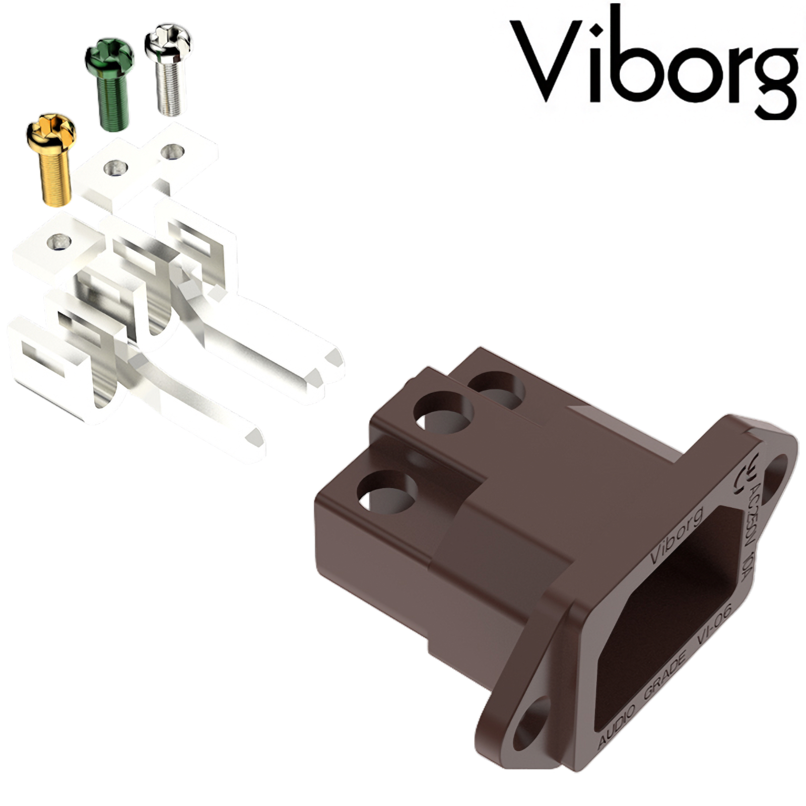 99.998% pure copper IEC C13/C15 chassis mount socket from Viborg, with three-layer plating: OFC copper, electroless silver plating, and finally, Rhodium plating. Superb build quality.
